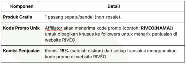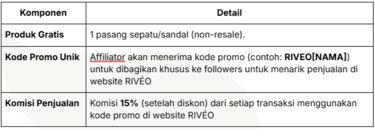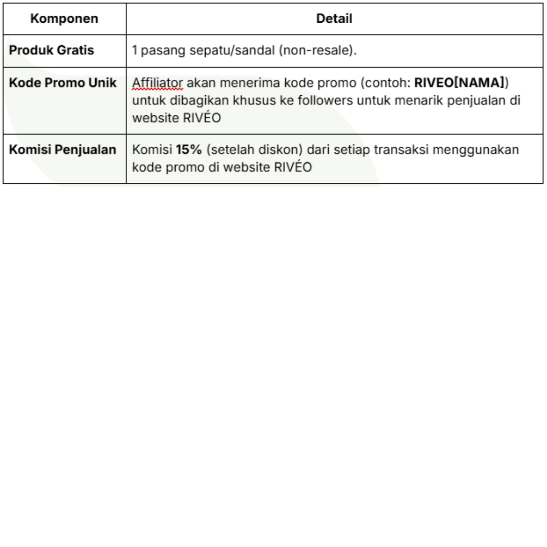Affiliator akan menerima 1 pasang sepatu/sandal RIVÉO (warna & series sesuai pilihan) sebagai produk kolaborasi.