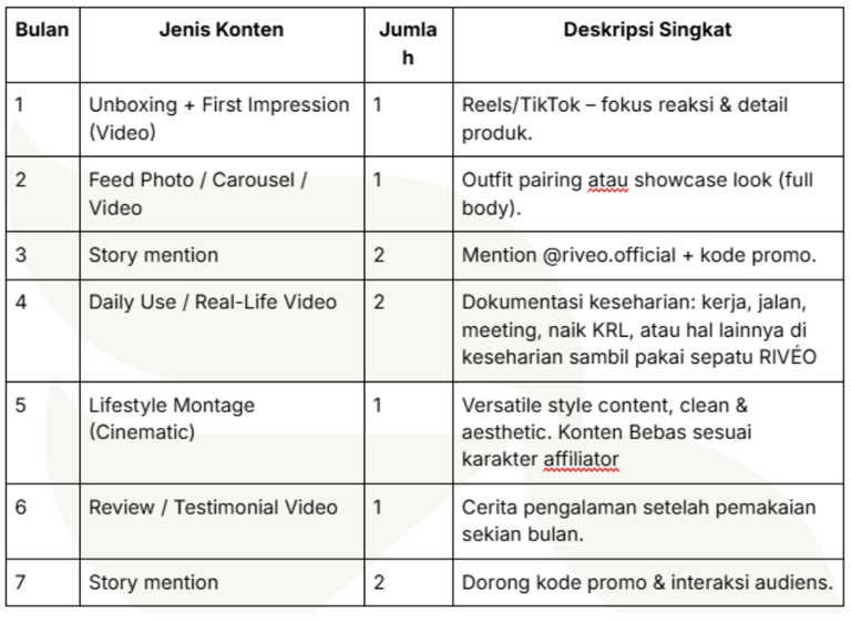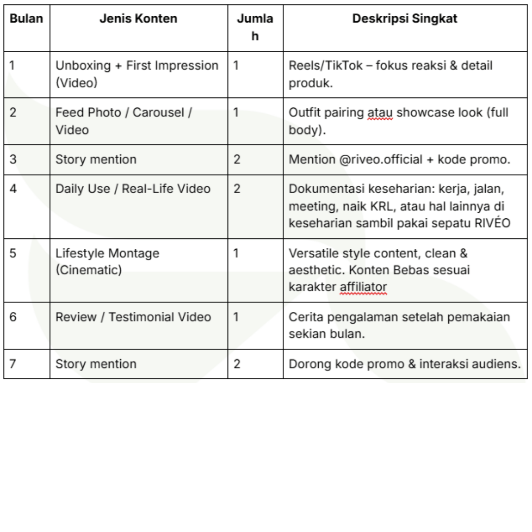 Memahami bahwa hasil konten dapat digunakan ulang oleh RIVÉO untuk keperluan promosi (dengan kredit kepada affiliator).