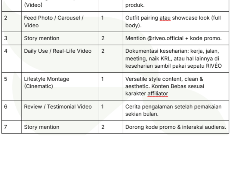 Semua konten harus mencantumkan tag @riveo.official dan hashtag #TheMovers #RIVEO #ComfortMadeStylish.