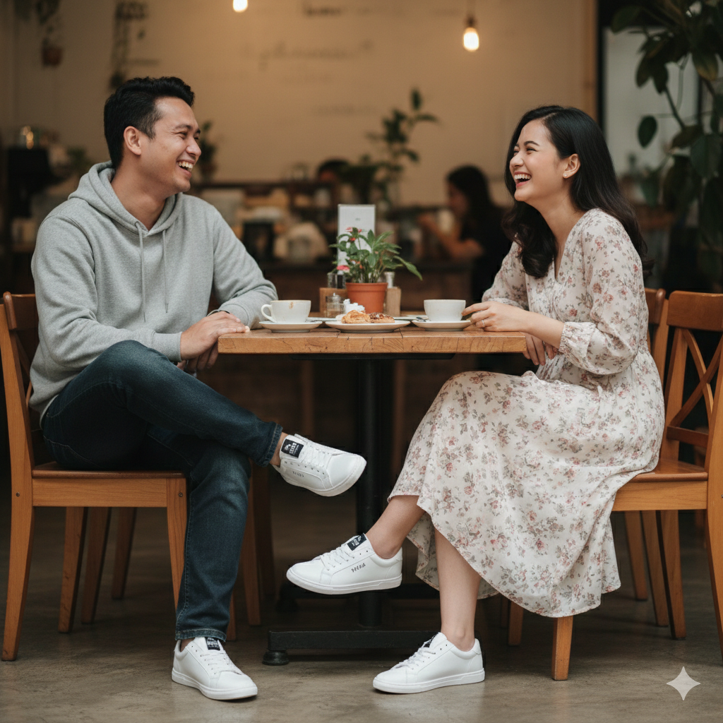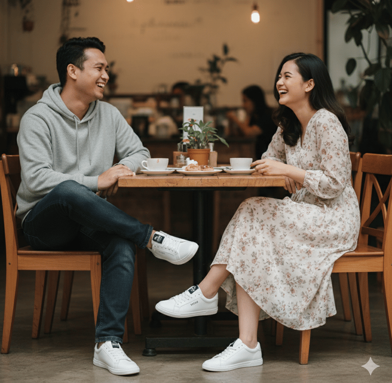 Sneaker yang serasi membuat komposisi visual jadi lebih rapi. Foto jalan berdua, duduk di coffee shop, atau candid saat traveling akan terasa lebih “beres”.