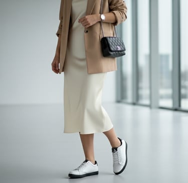 Buat tampilan semi-formal, coba padukan sepatu sneaker wanita Riveo dengan midi dress atau rok pensil. Tambahkan blazer untuk kesan rapi tapi tetap santai. Warna netral seperti beige, putih, atau pastel bisa bikin tampilan kamu tetap elegan tanpa berlebihan.